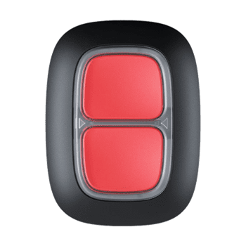 Brezžična panik tipka z dvema gumboma in plastično pregrado za zaščito pred nenamernimi pritiski. Aktiviranje s pritiskom na oba gumba: z enkratnim kratkim pritiskom ali dolgim pritiskom (več kot 2 sekundi). Če pritisnete le enega od gumbov se alarmni signal ne odda. IP55 zaščita, povezava s HUB-i in ojačevalci signala. Garancija 2 leti razen na vgrajene baterije. Črne barve.